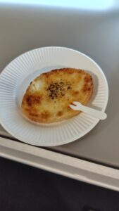飲み物とこのパン?を試食できます。これが、フランスパンの薄切りにザラメ?をふりかけ、バーナーで炙った物です。とっても美味しいですよ。ぜひ、ご賞味して頂きたいと思います。